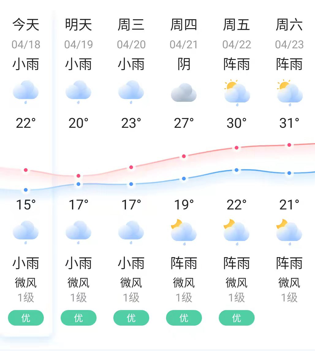 今天,阴天,有小雨,气温15-22℃。