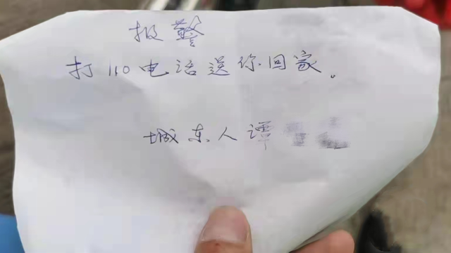 随后,民警在老人胸前的口袋里发现一张纸条,上面写着“报警 打110电话送你回家 城东人谭XX”,确定老人是走失后,民警便联系畲江派出所将老人带回。