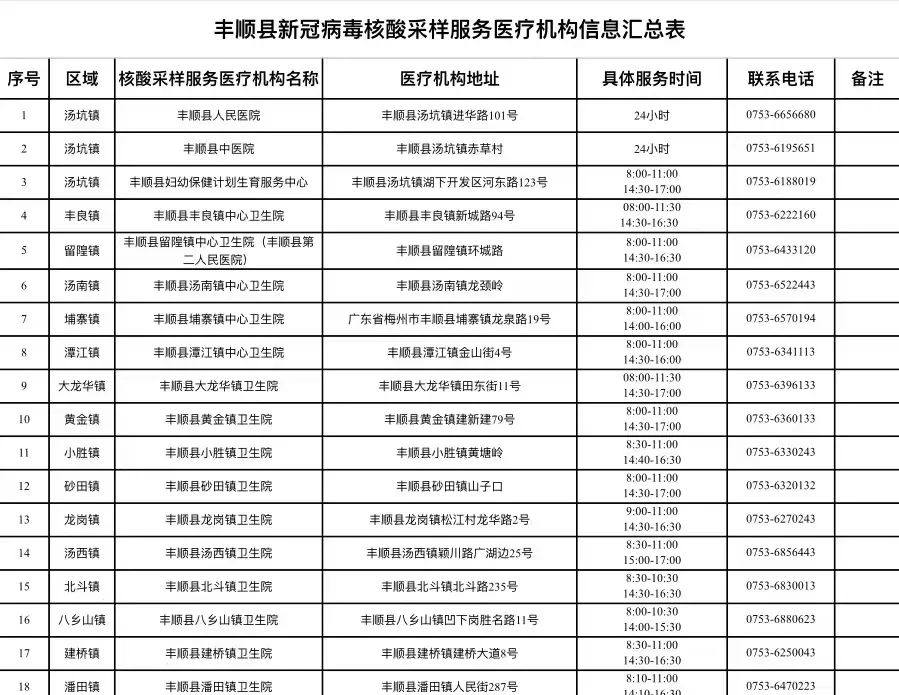 为进一步方便群众进行核酸采样,现公布丰顺县提供核酸采样服务点更新设置情况: