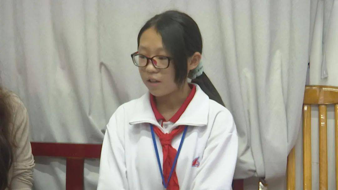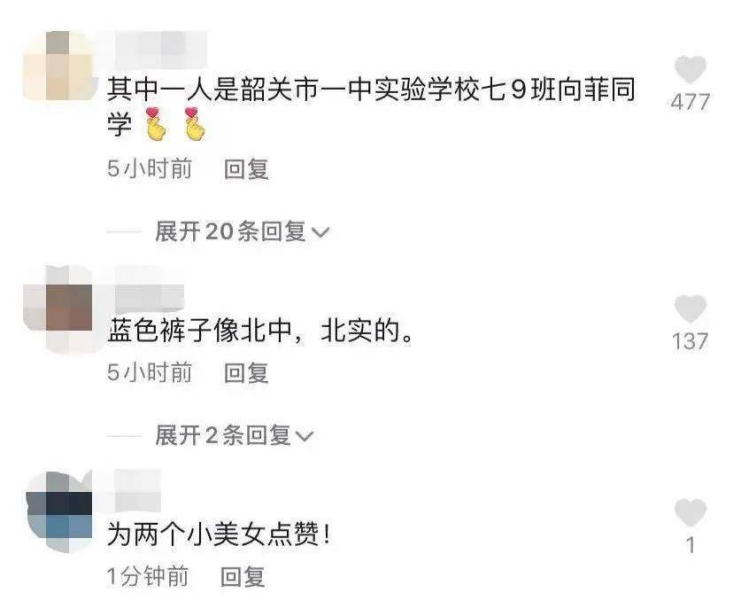 视频广泛流传的同时,身穿红白色校服的女生也找到了!她就是韶关市一中实验学校七年级的向菲同学。