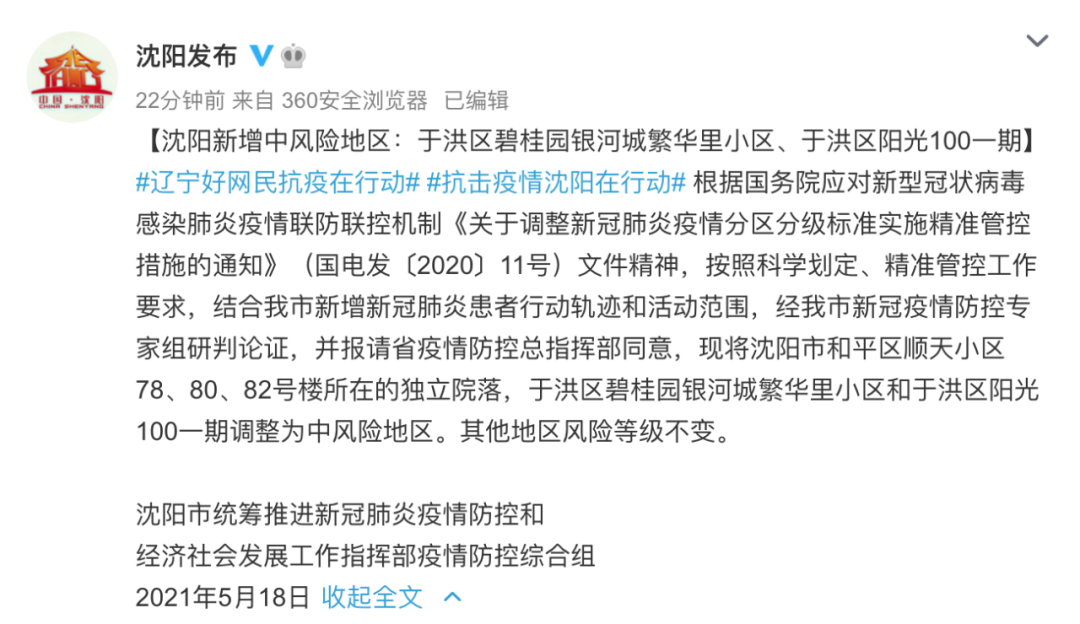 5月18日17时,据@沈阳发布微博消息,辽宁沈阳市和平区顺天小区78、80、82号楼所在的独立院落,于洪区碧桂园银河城繁华里小区和于洪区阳光100一期调整为中风险地区。其他地区风险等级不变。